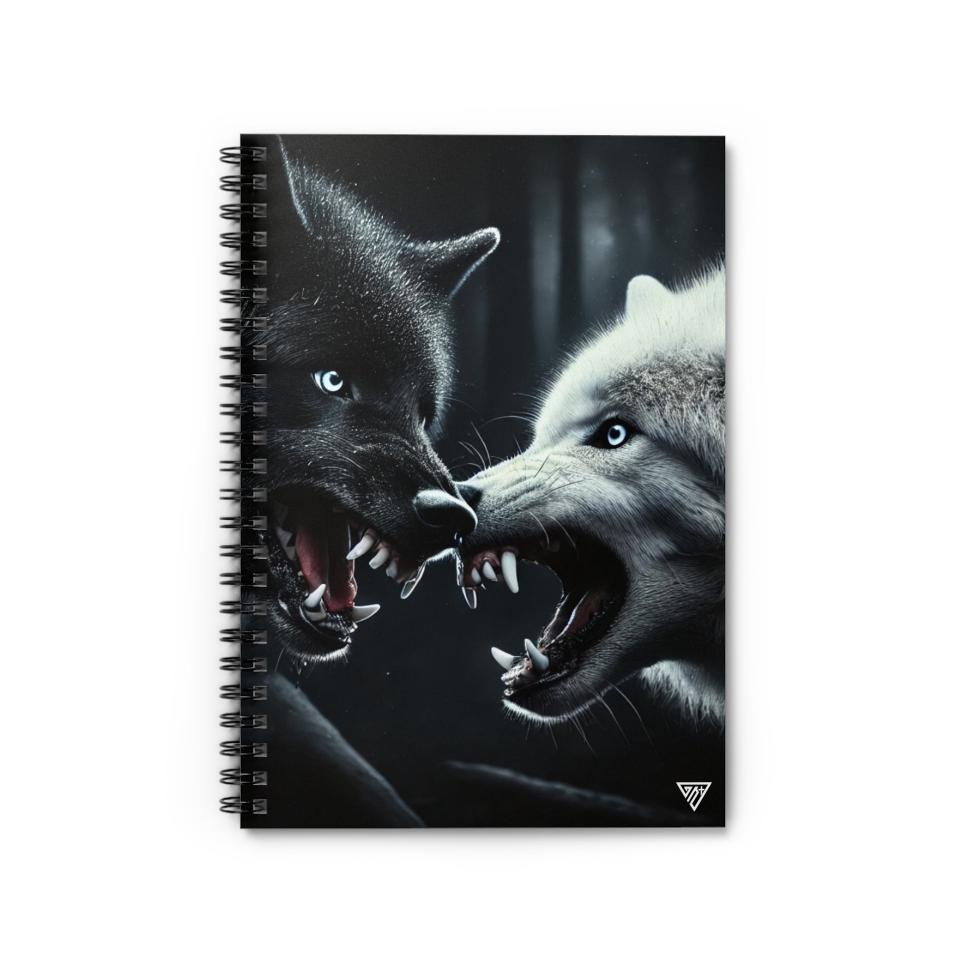 Fantasy spiral notebook featuring a light and dark wolf design.