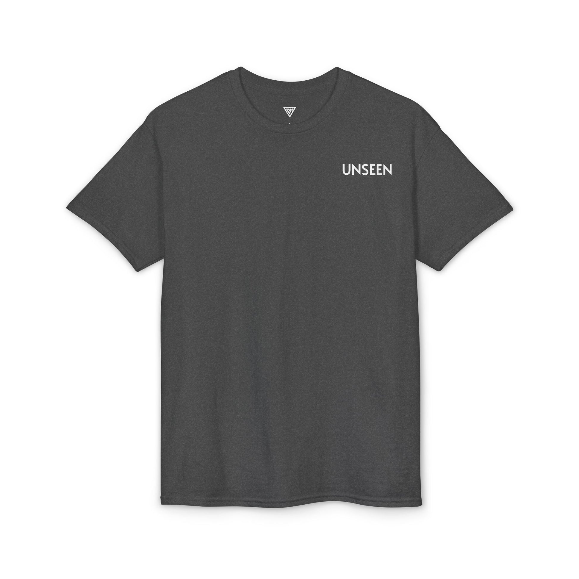 The front remains minimal with the word UNSEEN, while the back reveals the full emblem and circular message—anchored by the Ghost Nation symbol and grounded in quiet strength. Built for movement, reflection, and everyday resolve.